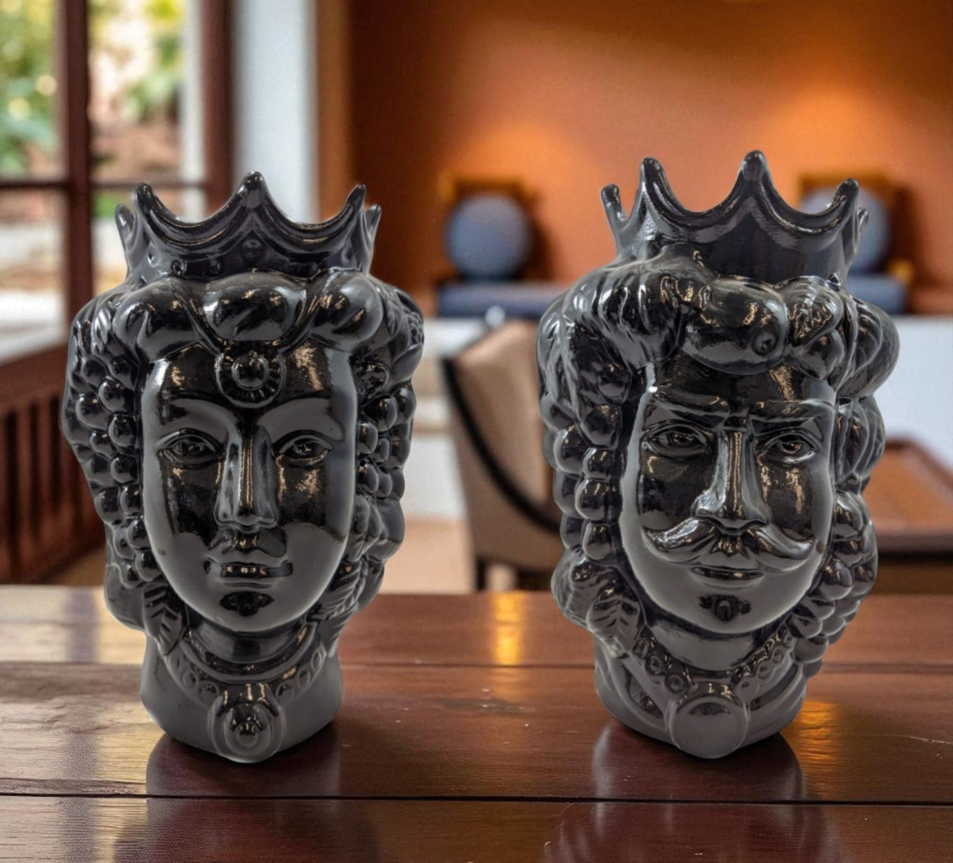 Immergiti nella magia della Sicilia con questa coppia di Teste di Moro in ceramica alta 23 cm, realizzate a mano da maestri artigiani. Ogni pezzo è una scultura unica, simbolo di passione, tradizione e arte mediterranea.