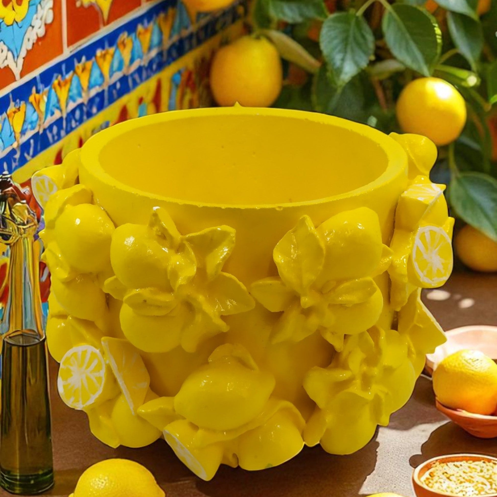 Vaso artigianale in cemento porcellanato con limoni e foglie – Design Coprivaso mediterraneo fatto a mano in Italia (20×30×20 cm)